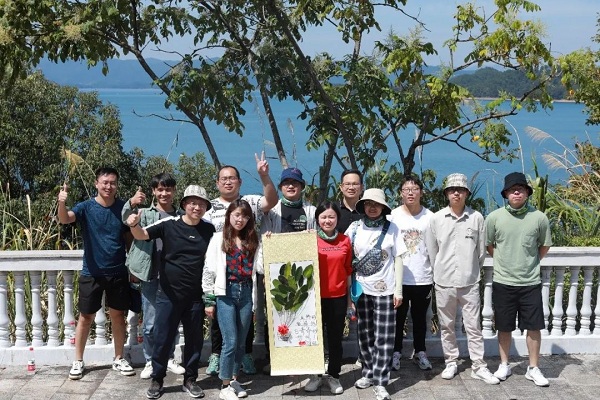 抵達騎行終點后,大家拿出沿途收集的各種枝葉花果,要利用這些自然素材,在畫紙上自由搭配,來創(chuàng)作出最能展現(xiàn)團隊理念和企業(yè)文化的天合之作。幾位小朋友此時成了創(chuàng)作主角,天馬行空的想象力令人嘆為觀止。經過20分鐘緊張的集思廣益和通力合作,每個小組都捧出了自己的作品。通過代表們的解釋,大家也對看似粗陋,實則富有寓意的設計大為感動。既有對此時此景“島在水中走,水在山中流”的流連,也有“團結拼搏,星星之火,可以燎原”的堅守、“你是我,我是你,一成隊,隊是一”的團結,“火熱的激情,揚飛青春的夢想”的奮進,更有對公司“基業(yè)長青”、“國泰民安,成功在即”的祝福和展望。
